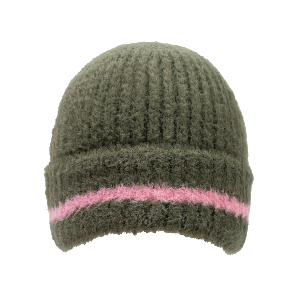 Dents Feather Yarn Beanie Hat With Contrast Stripe - Olive/Pink