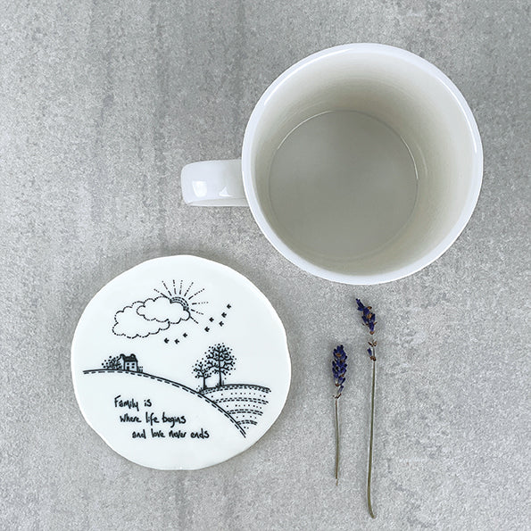 Add a charming touch to your table with this playful porcelain coaster, measuring a neat 9.8 x 9.7 x 0.8 cm. Its whimsical message, "Family Is Where Life Begins And Love Never Ends" makes every drink a lovely reminder of family. Durable and easy to clean, it's designed to protect surfaces while sparking smiles.