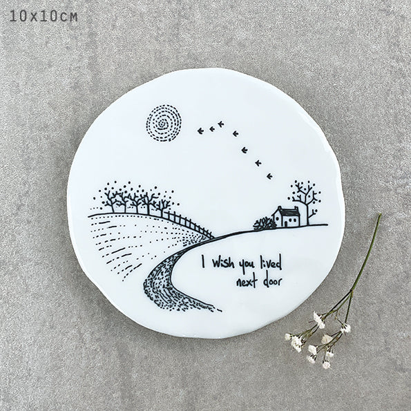 Add a charming touch to your table with this playful porcelain coaster, measuring a neat 9.8 x 9.7 x 0.8 cm. Its whimsical "Wish You Lived Next Door" message makes every drink a friendly reminder of good company, perfect for brightening up your cozy countryside moments. Durable and easy to clean, it's designed to protect surfaces while sparking smiles.
