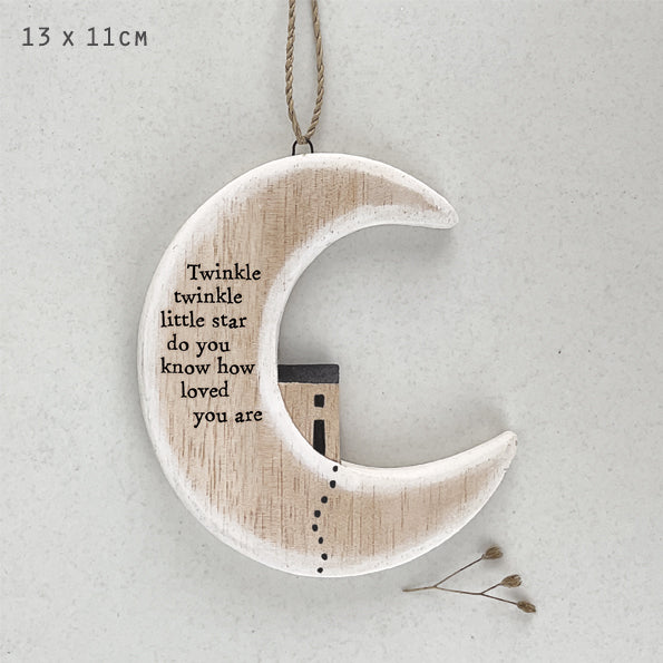 Bring celestial magic to any nursery with this charming wooden moon decoration. Featuring the beloved "Twinkle Twinkle Little Star" verse, it's the perfect keepsake for little ones. Measuring 13 x 12 x 1cm, this delightful piece combines whimsical design with heartfelt sentiment, making it an ideal gift for baby showers, christenings, or simply adding a touch of starry wonder to a child's room. A timeless treasure that celebrates the special bond between parent and child.