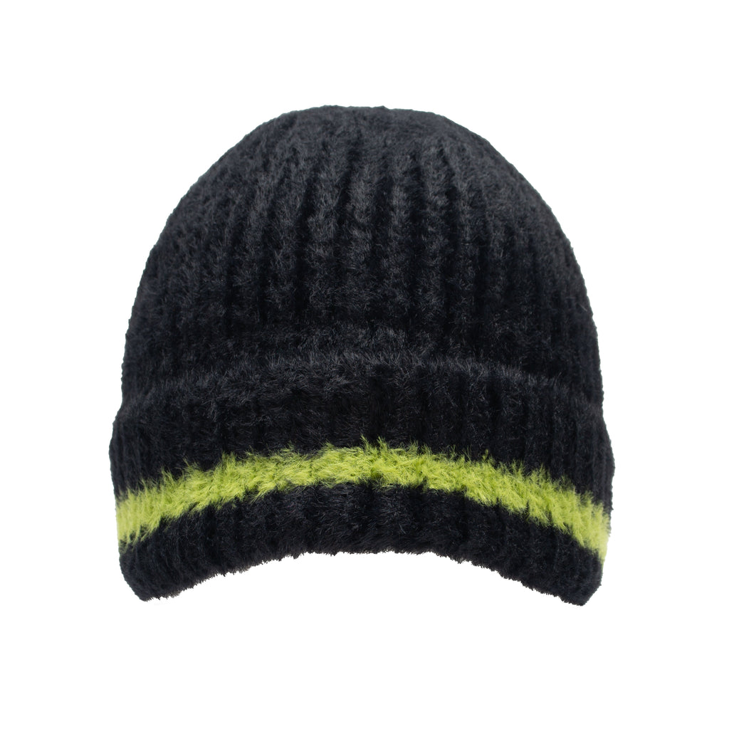 Dents Feather Yarn Beanie Hat With Contrast Stripe - Black/Lime