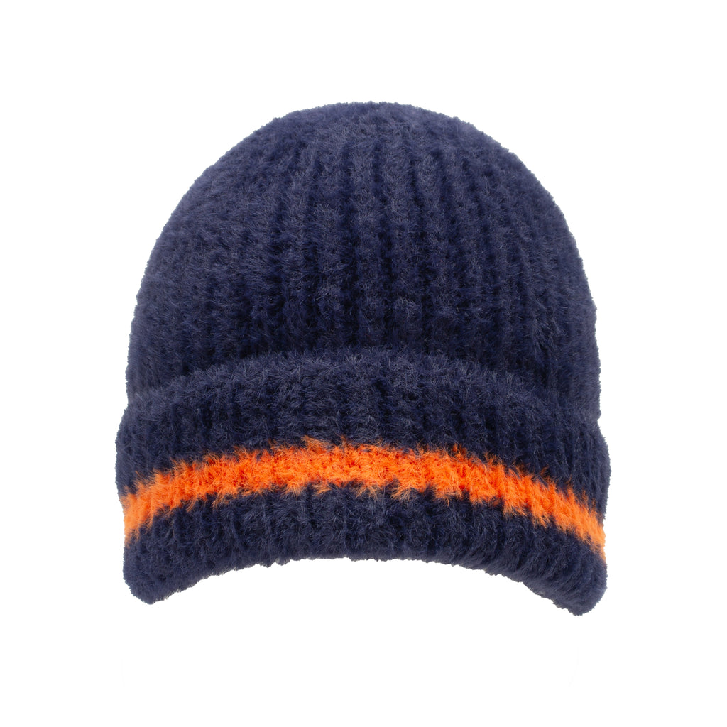 Dents Feather Yarn Beanie Hat With Contrast Stripe - Navy/Pumpkin