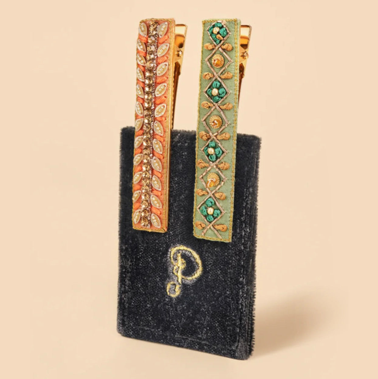 Powder Narrow Jewelled Ribbon Hairclip - Sage/Coral
