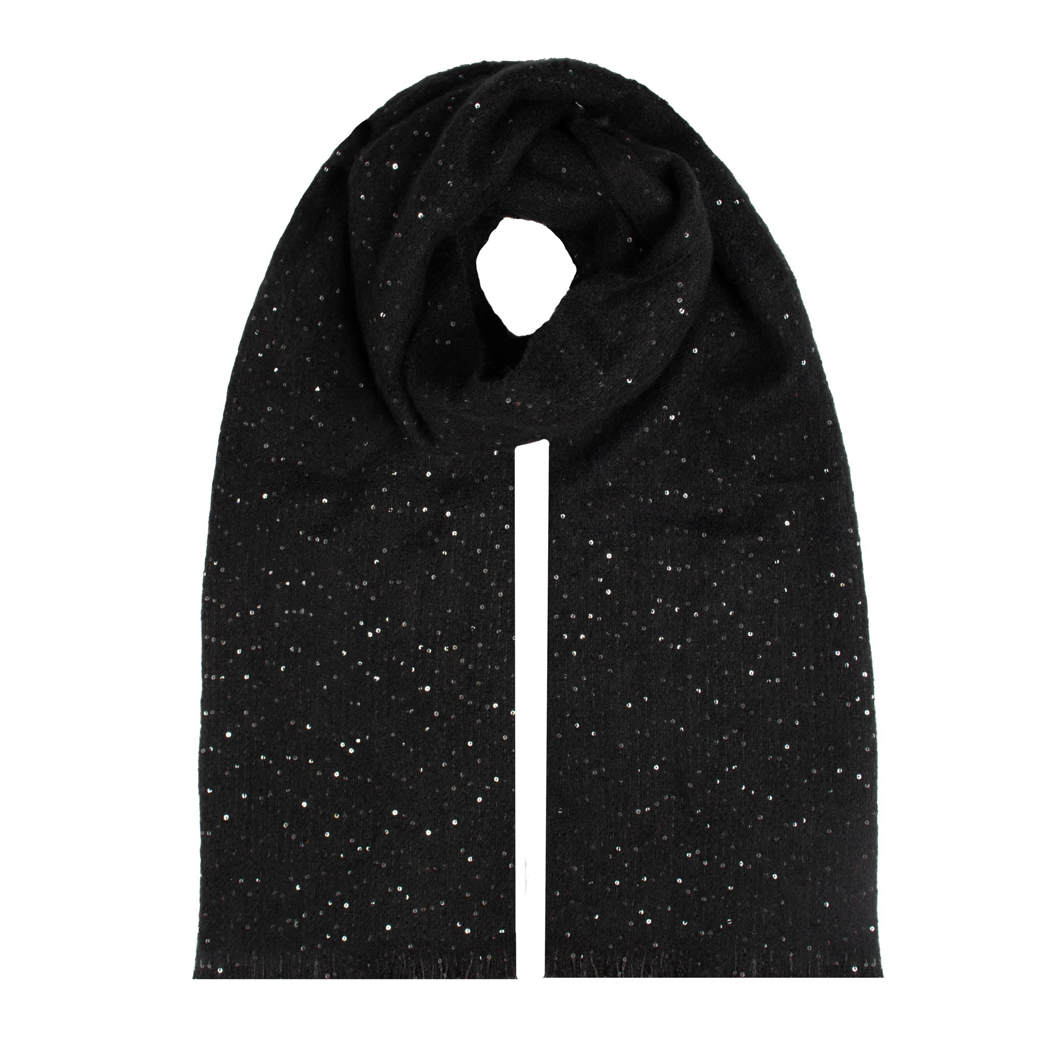 Transform your winter wardrobe with our stunning sequin scarf. Adorned with delicate discs that shimmer and shine, this scarf adds a touch of feminine allure to any outfit. The sequins dazzle against a solid backdrop, the scarf’s single-colour design allowing their brilliance to truly shine.  Finished with soft fringing, this statement accessory effortlessly elevates your everyday elegance or enhances your most formal looks. Instant glitz for grown-up glamour.
