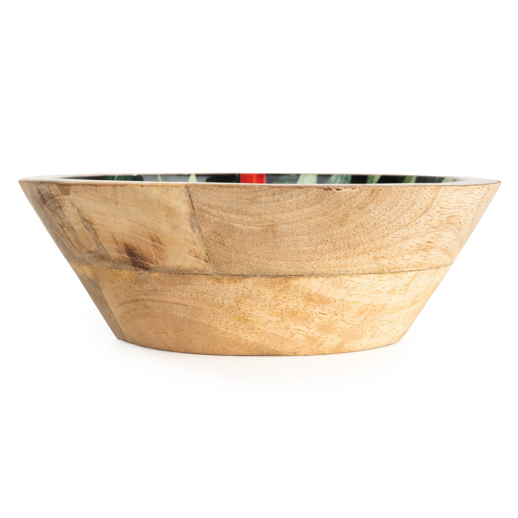 This versatile Medium Mango Wood Bowl with Enamel Print is a true statement piece for any home, blending natural beauty with a bold design. Crafted from sustainably sourced mango wood, this bowl features a striking enamel interior adorned with vivid chilli and leaf motifs, giving it a vibrant, eye-catching look. The smooth contours and organic feel of the wood contrast beautifully with the glossy finish of the enamel, making it ideal for both functional use and decorative display. Perfect for serving or as a unique centrepiece, this bowl brings a touch of artisanal charm to any setting.